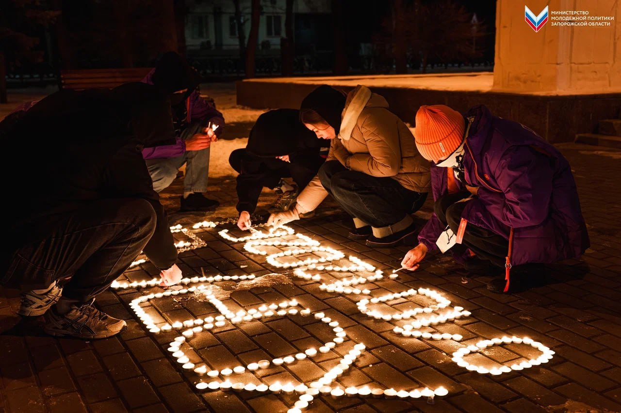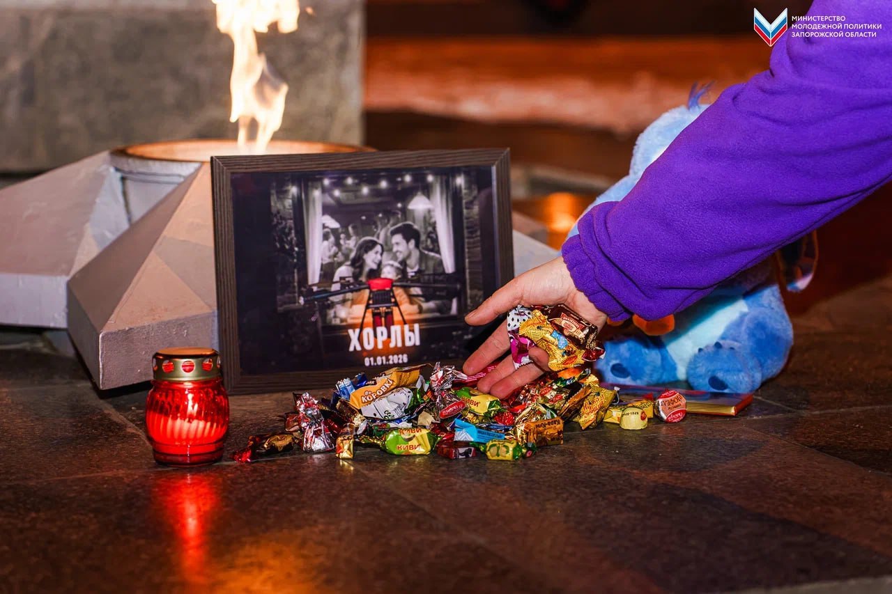 Активисты молодёжных движений Запорожской области провели памятную акцию в честь жертв обстрела Херсонской области в новогоднюю ночь. На территории Мемориального кладбища участники выложили из зажжённых свечей надпись «ХОРЛЫ 01.01.2026» и оставили детские игрушки и сладости.